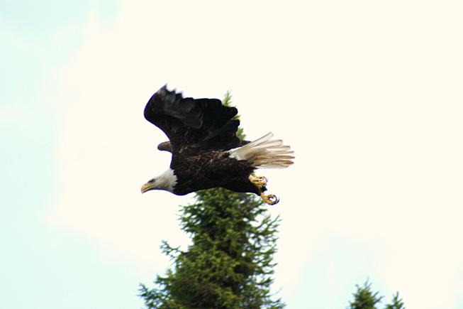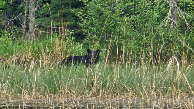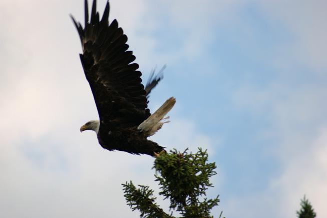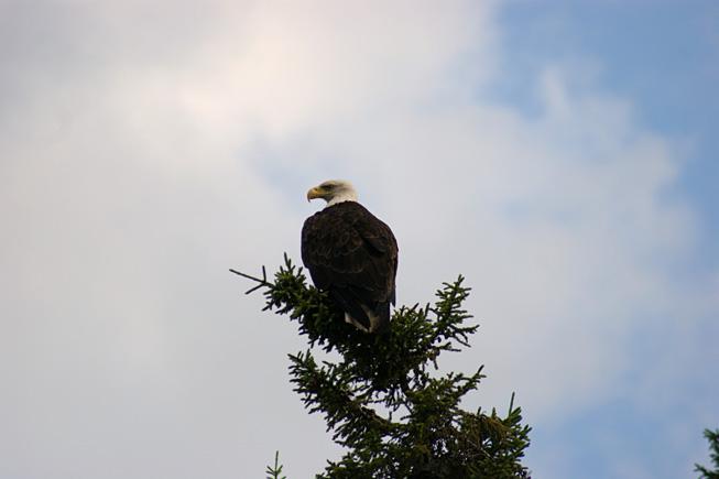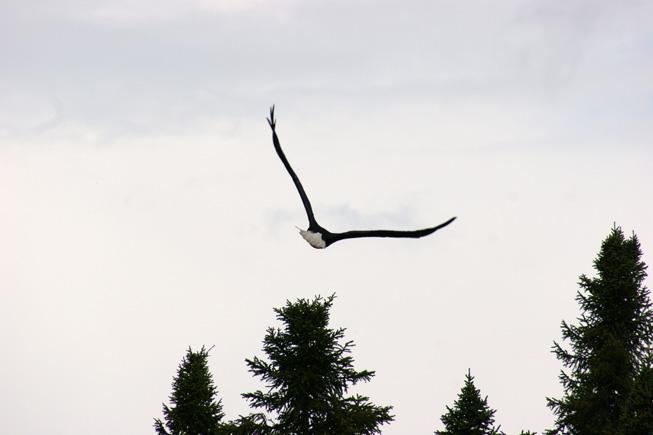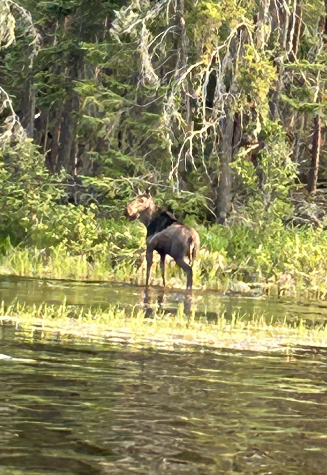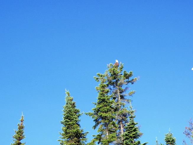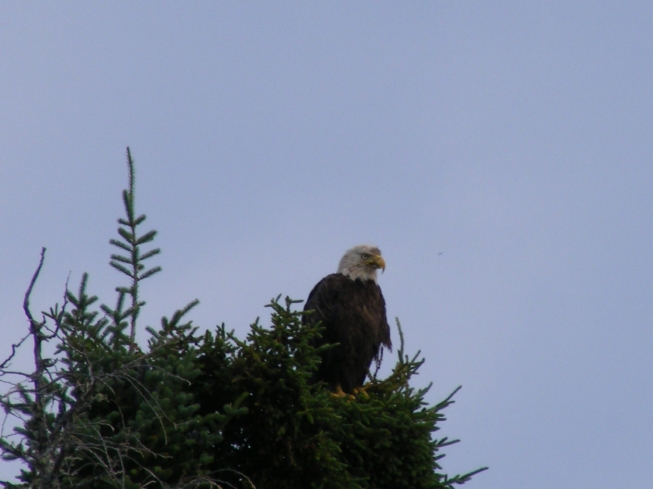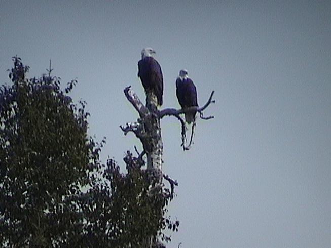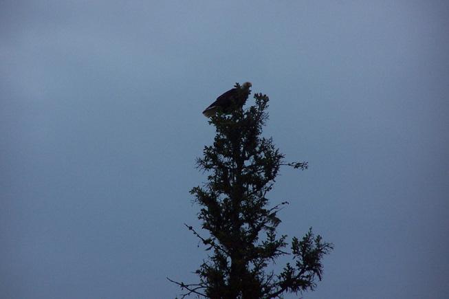 On our first day we snuck up on a cow moose- how absolutely breathtaking! (We have this on camcorder) Another day, we observed 4 otters playing and swimming near shore on some rocks. Just adorable! Then, there were the many bald eagles we spied, so majestic! Warren and I have been blessed by being able to stay at Boois Island.